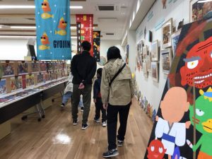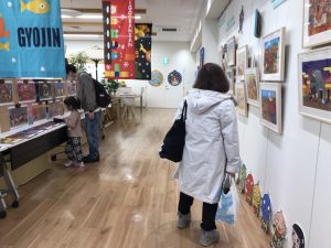 ほんでほんでの棚をはじめ、おりがみツリーや、2階ギャラリーまで、たかいよしかずさんの作品に出てくるキャラクターたちがお迎え!