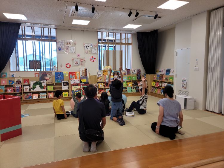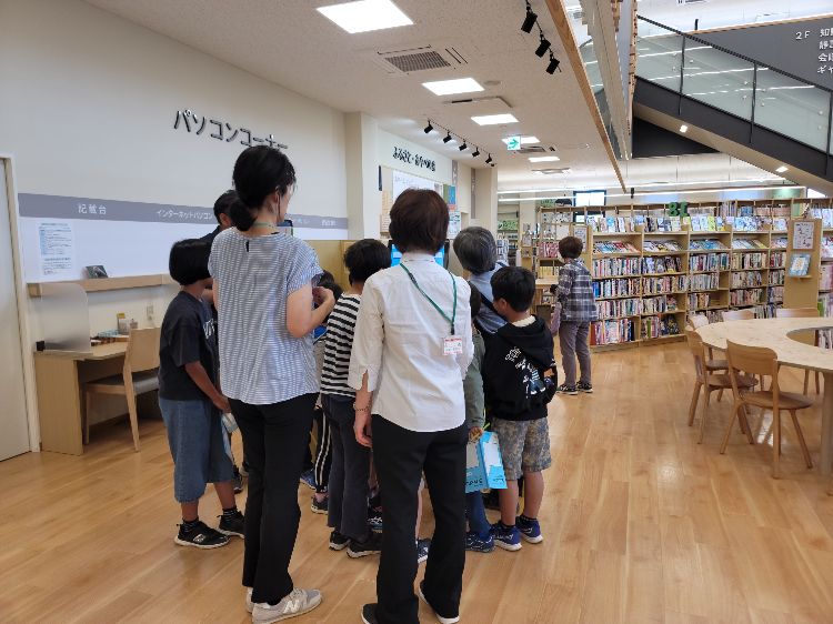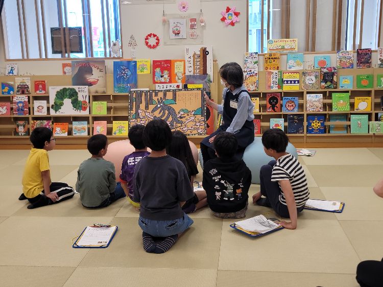 図書館の中を1階、2階と見学した後、職員による絵本の読み聞かせを聞きました。