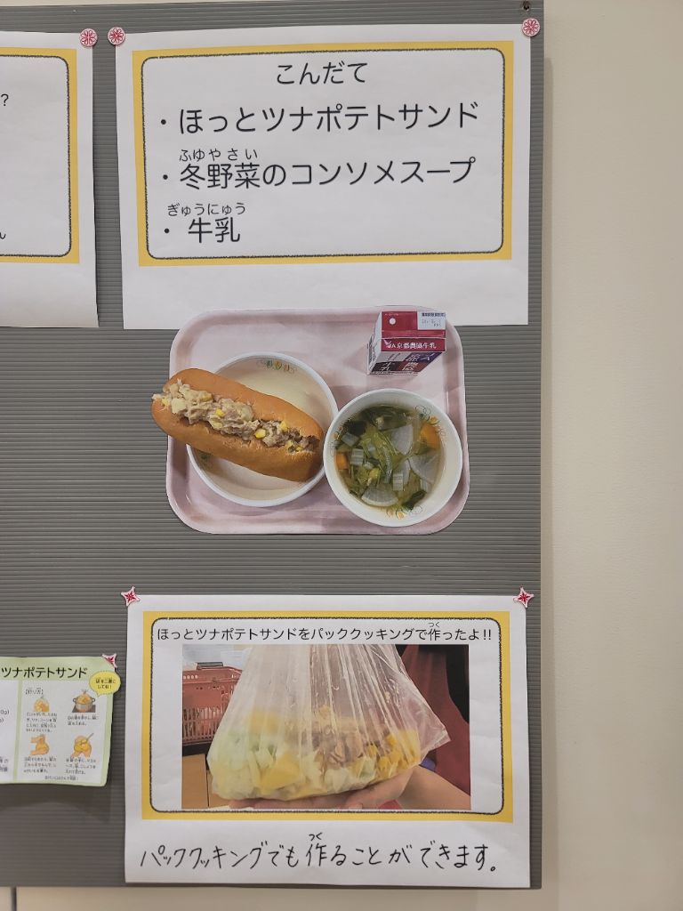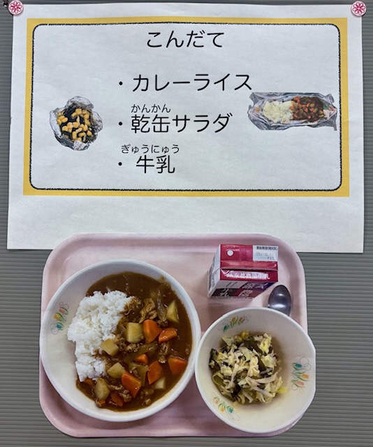 子どもたちが災害時の食事をイメージし、防災意識を高めること、食のありがたみや感謝の気持ちを育むこと、生活に活かすことを目的とした展示です。