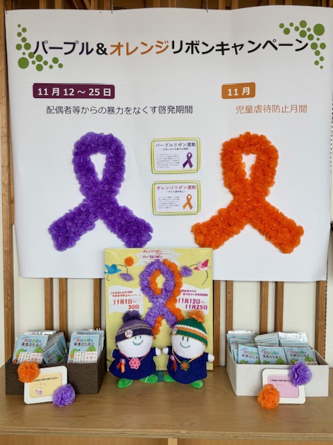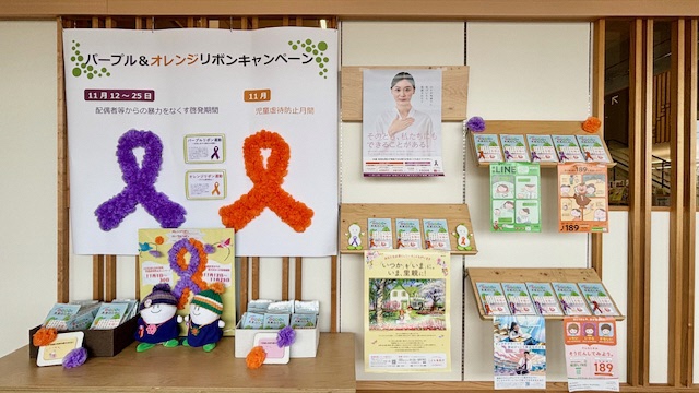 「配偶者等からの暴力をなくす啓発期間」(11月12日〜25日)、「オレンジリボン・児童虐待防止推進キャンペーン」(11月1日〜30日)に合わせて、広く市民に対し、暴力根絶及び虐待防止等に向けた啓発展示を行っています。