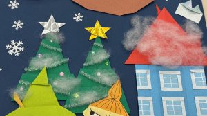 家の屋根や、飾りつけられたモミの木には雪が積もっています。