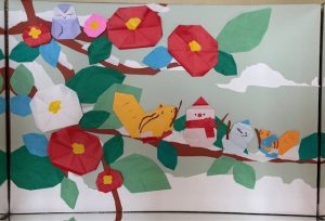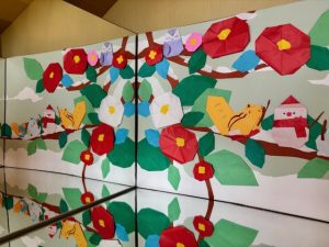 椿の花は全部でいくつ咲いているでしょう?図書館に来たら、ゆっくり眺めて数えてみてくださいね!