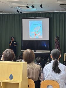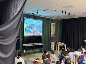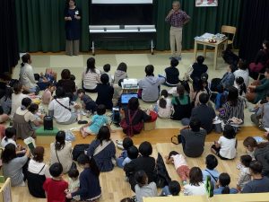 岡田先生の歌と演奏で盛り上がってから、いよいよ岡田先生による絵本の読み聞かせです!