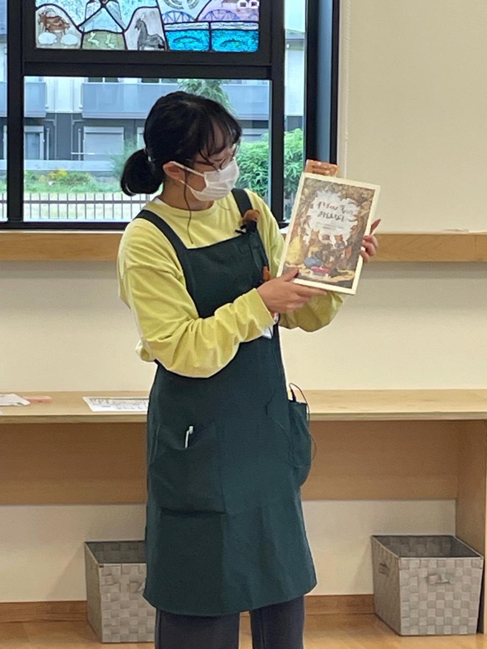 落ち葉の中に、木の枝に、葉っぱや枝そっくりの虫が隠れている写真絵本。みなさんわいわい楽しく眺めておられます!
